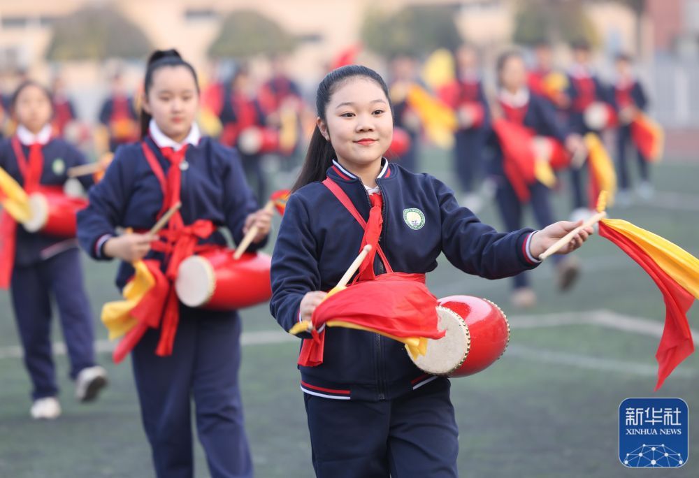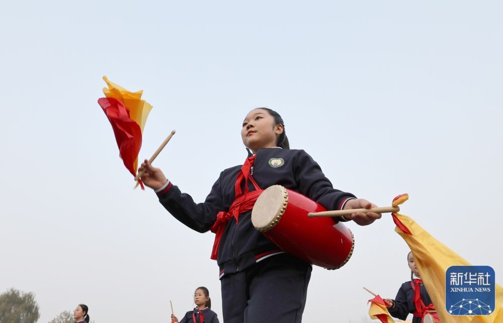 ↑11月22日,河北省霸州市胜芳镇红光小学的学生在表演腰鼓。