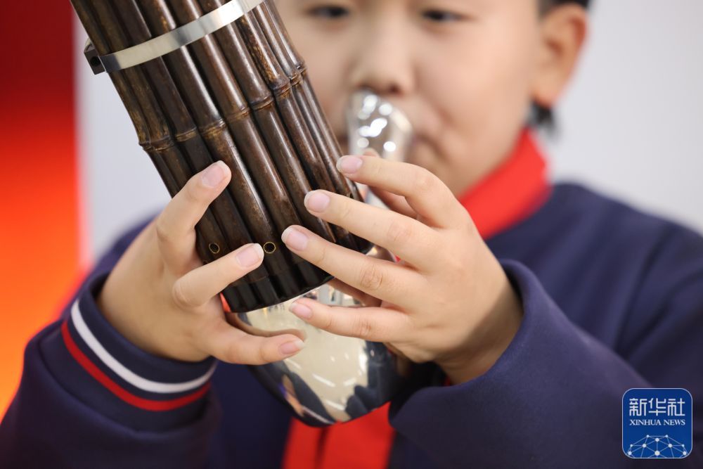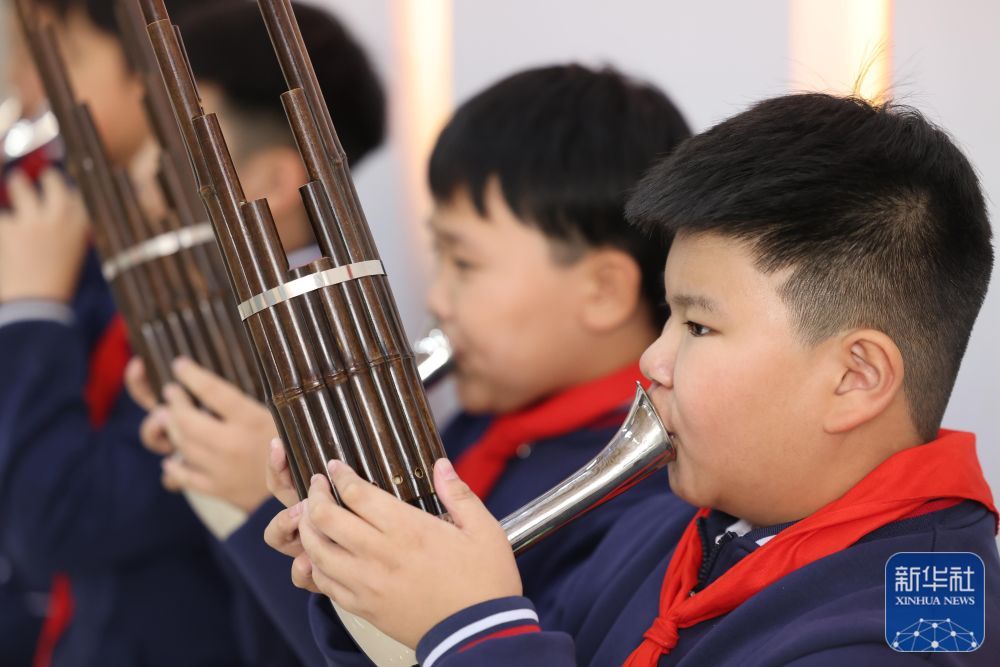 ↑11月22日,河北省霸州市胜芳镇红光小学的学生在排练笙管乐。