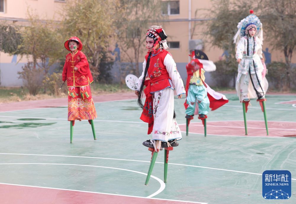 ↑11月22日,河北省霸州市胜芳镇红光小学的学生在排练高跷。