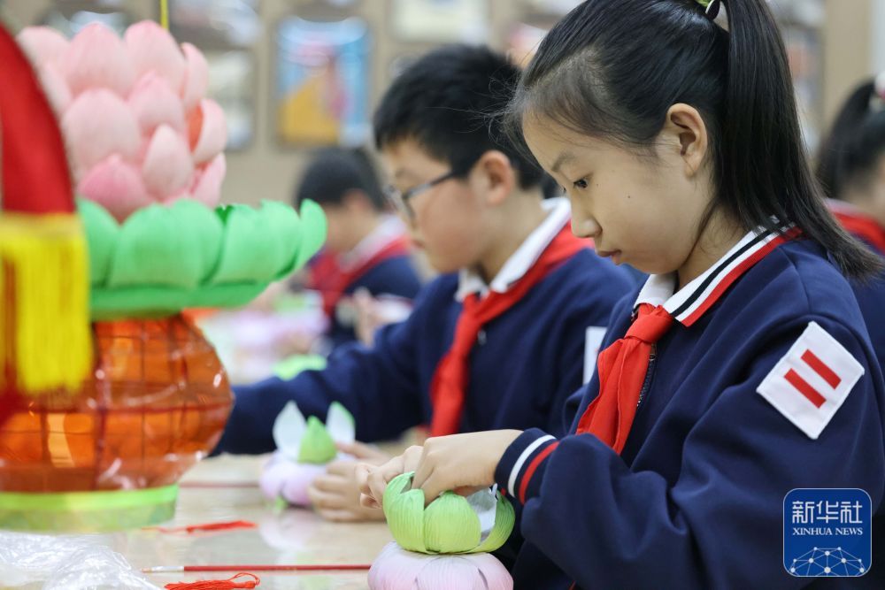 ↑11月22日,河北省霸州市胜芳镇红光小学的学生在学习制作胜芳花灯。