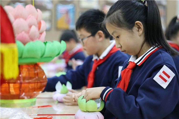 11月22日,河北省霸州市胜芳镇红光小学的学生在学习制作胜芳花灯。