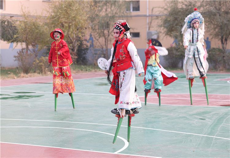 11月22日,河北省霸州市胜芳镇红光小学的学生在排练高跷。