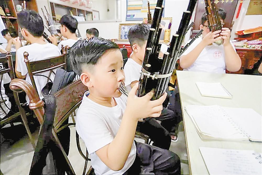 “近几年,放暑假前我会到镇里的小学去宣传,挨个教室转,向学生们介绍南音乐会。现在来学习的孩子有两批,共20人左右。学习一般定在每周五、周六和寒暑假的晚上七点到九点。”当晚教学的是胜芳南音乐会负责人杨梦喜,他自幼学习传统笙管乐,参与义务教学两年多。这些孩子最小的9岁,最大的13岁。他们有的吹管,有的捧笙,有的打铙,在师傅的引导下学习演奏优美的古音乐。