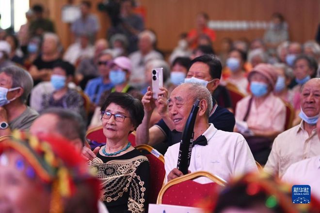 河北廊坊三河市燕达金色年华健康养护中心入住老人在观看文艺汇演(7月20日摄)