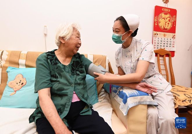 河北廊坊三河市燕达金色年华健康养护中心医务人员为入住老人测量血压(7月20日摄)