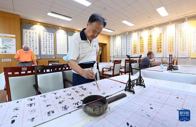 河北廊坊三河市燕达金色年华健康养护中心入住老人在活动室练习书法(7月20日摄)