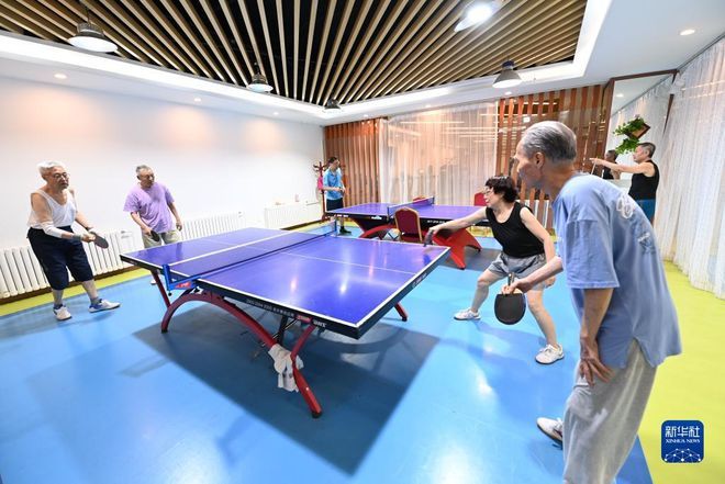 河北廊坊三河市燕达金色年华健康养护中心入住老人在娱乐室打乒乓球(7月20日摄)