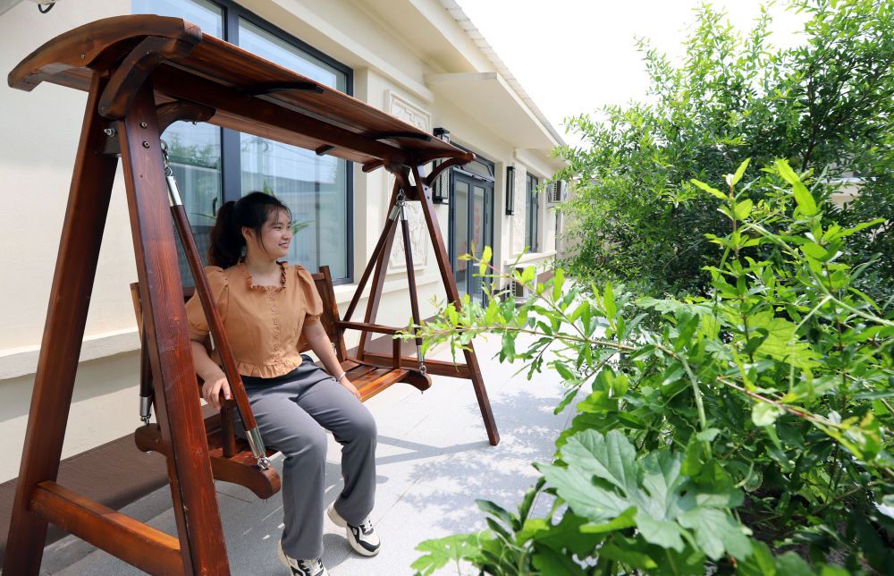 ↑8月1日,在大城县留各庄镇东留各庄村一处美丽庭院内,庭院主人正在乘凉休息。(金天 摄)