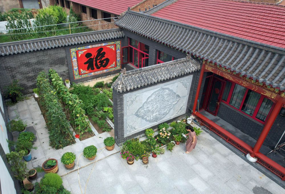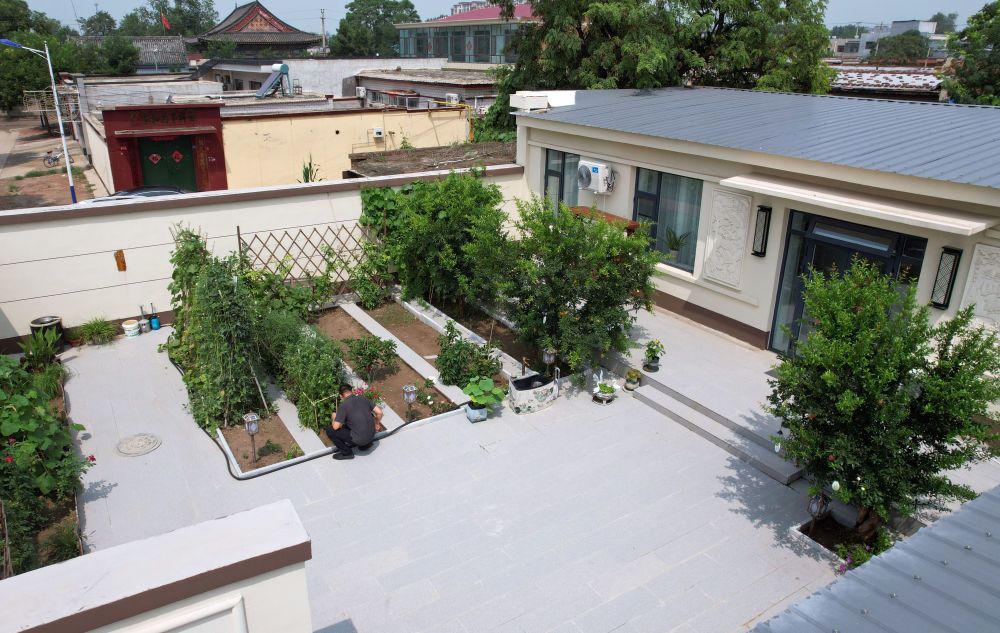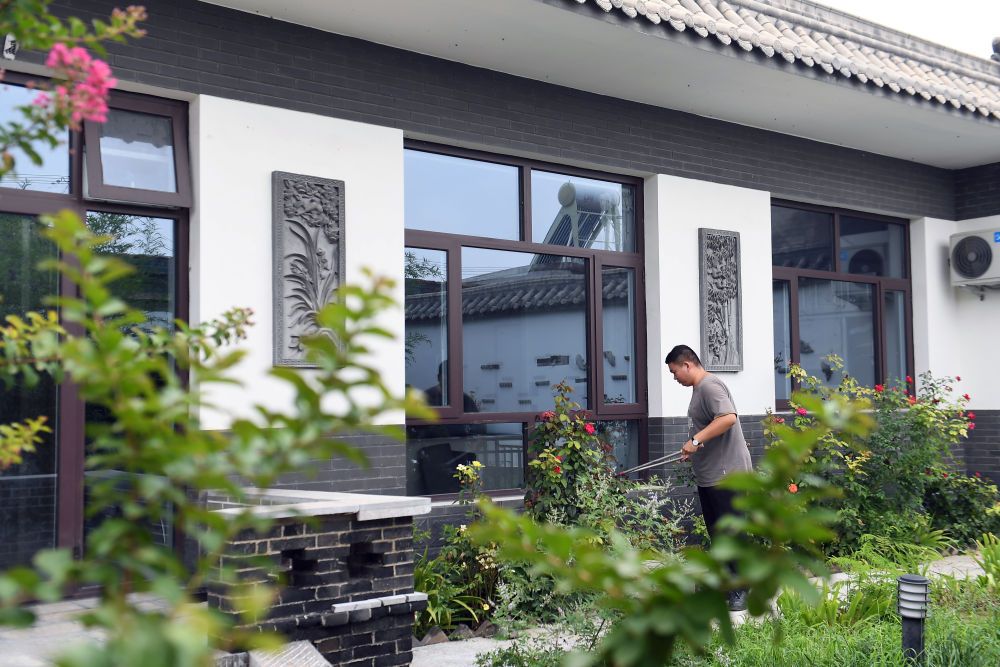 ↑8月1日,在大城县广安镇西流河村一处美丽庭院内,庭院主人正在修剪花草。(金天 摄)