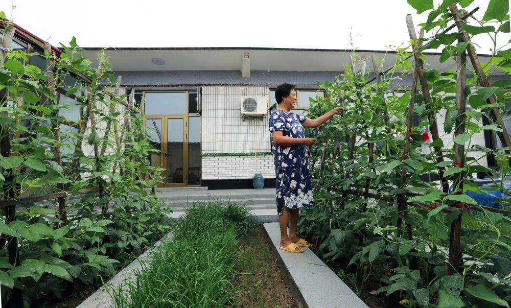 ↑8月1日,在大城县臧屯镇桑杭村一处美丽庭院内,庭院主人正在采摘蔬菜。(金天 摄)