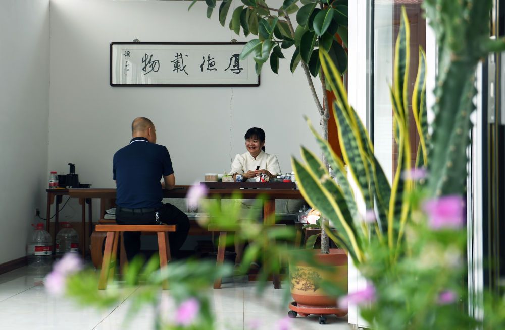 ↑8月1日,在大城县臧屯镇桑杭村一处美丽庭院内,庭院主人和邻居正在喝茶聊天。(金天 摄)