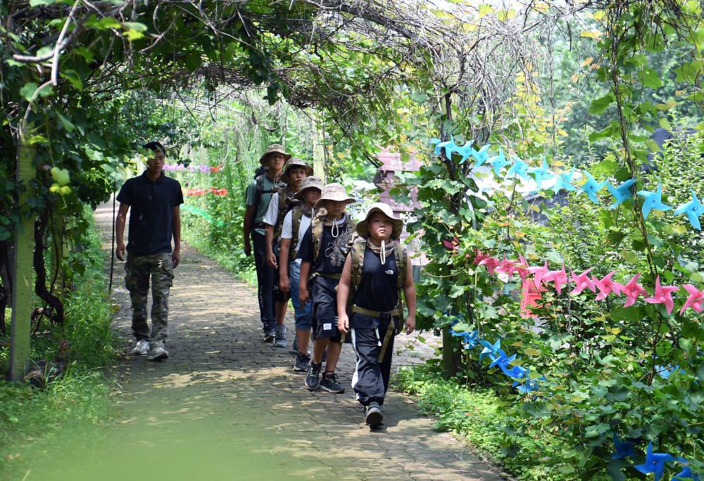 ↑8月8日,在大城县臧屯镇夏令营中心,孩子们正在进行负重徒步训练。(金天 摄)