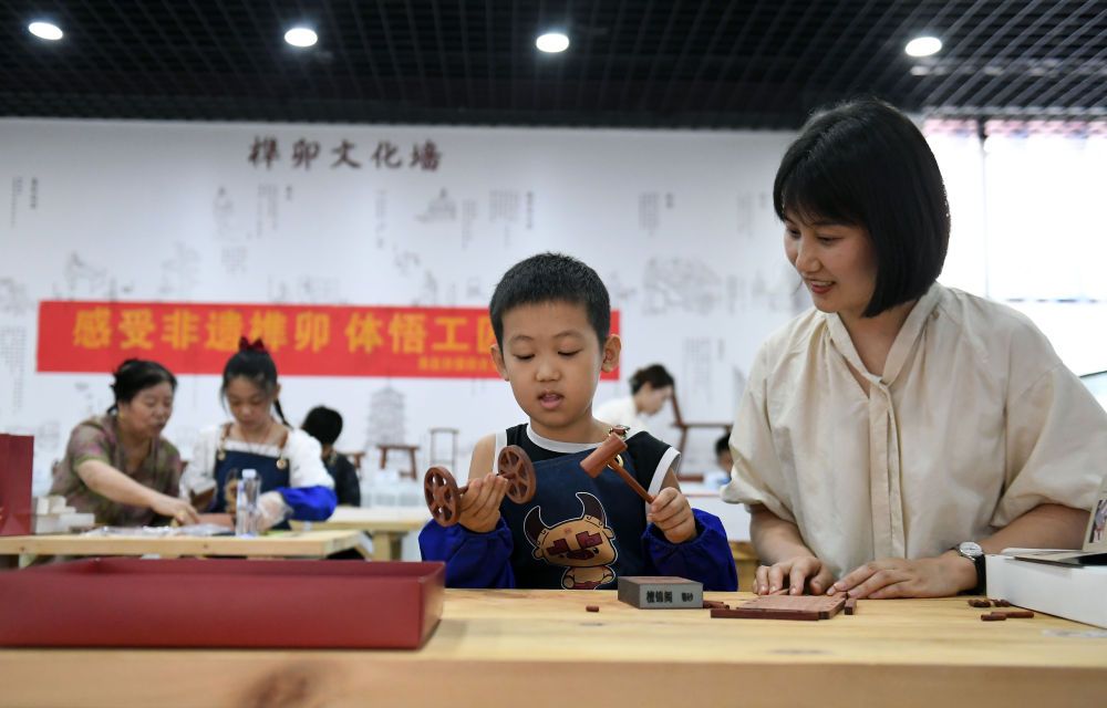 ↑8月8日,孩子们在大城县红木文化体验馆体验榫卯结构组合拼装的乐趣。(金天 摄)