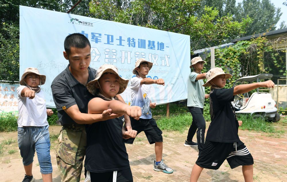 ↑8月8日,在大城县臧屯镇夏令营中心,孩子们正在学习军体拳。(金天 摄)