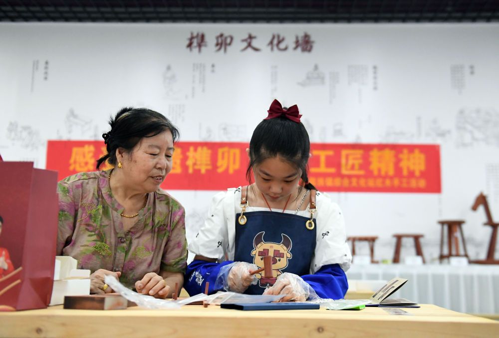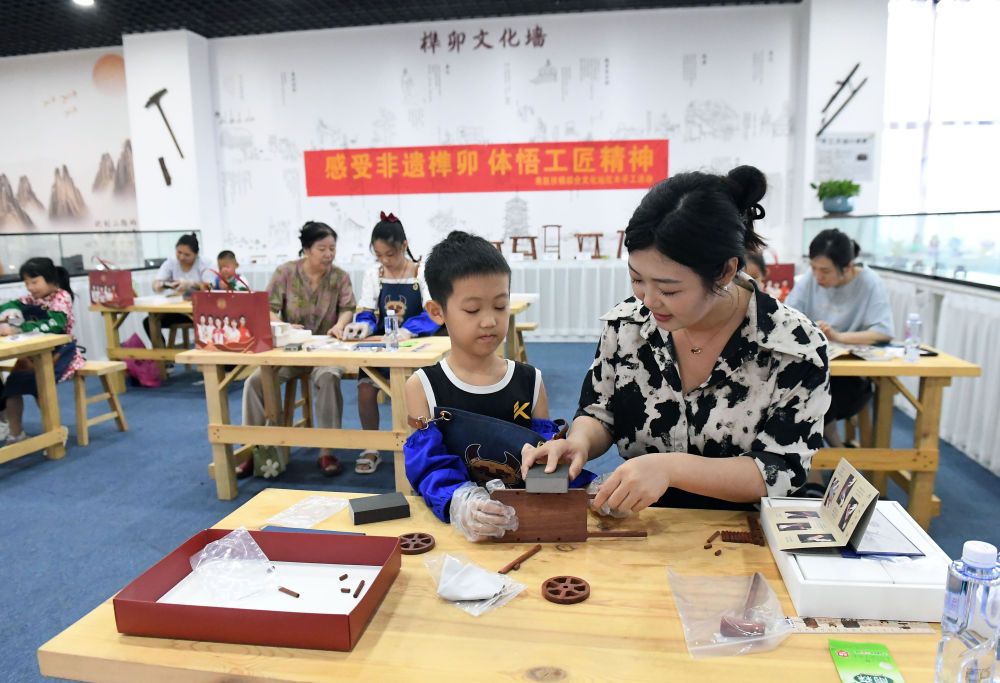 ↑8月8日,在大城县红木文化体验馆内,家长和孩子们一起体验榫卯工艺。(金天 摄)