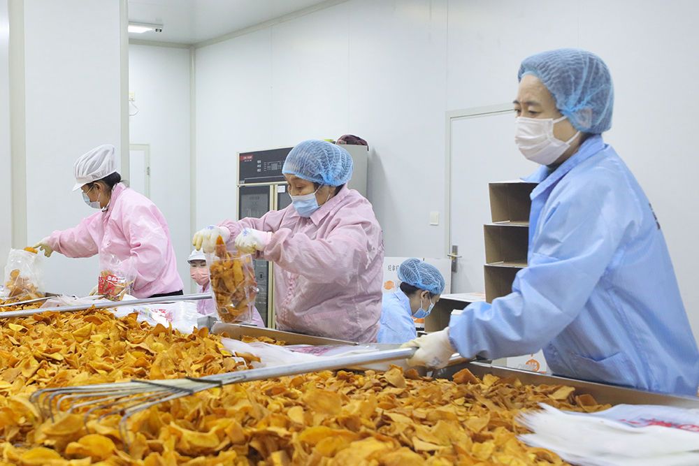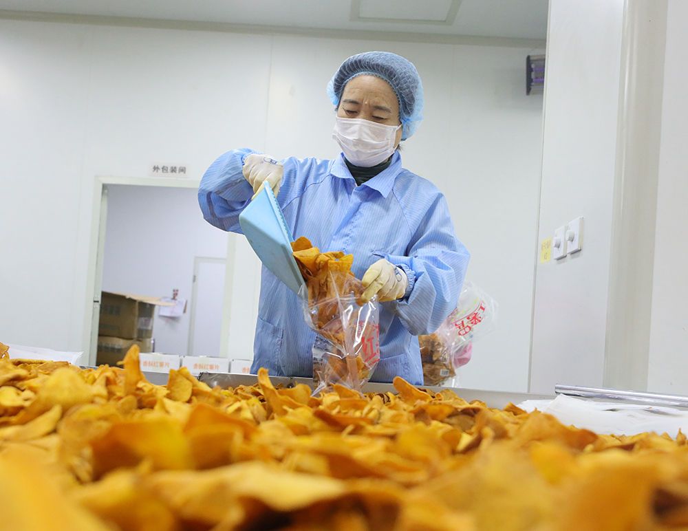 ↑11月6日,在固安县马庄镇一家红薯加工企业,工人在打包红薯片。(肖靖凯 摄)