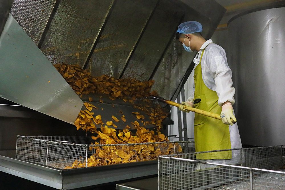 ↑11月6日,在固安县马庄镇一家红薯加工企业,工人在炸制红薯片。(肖靖凯 摄)