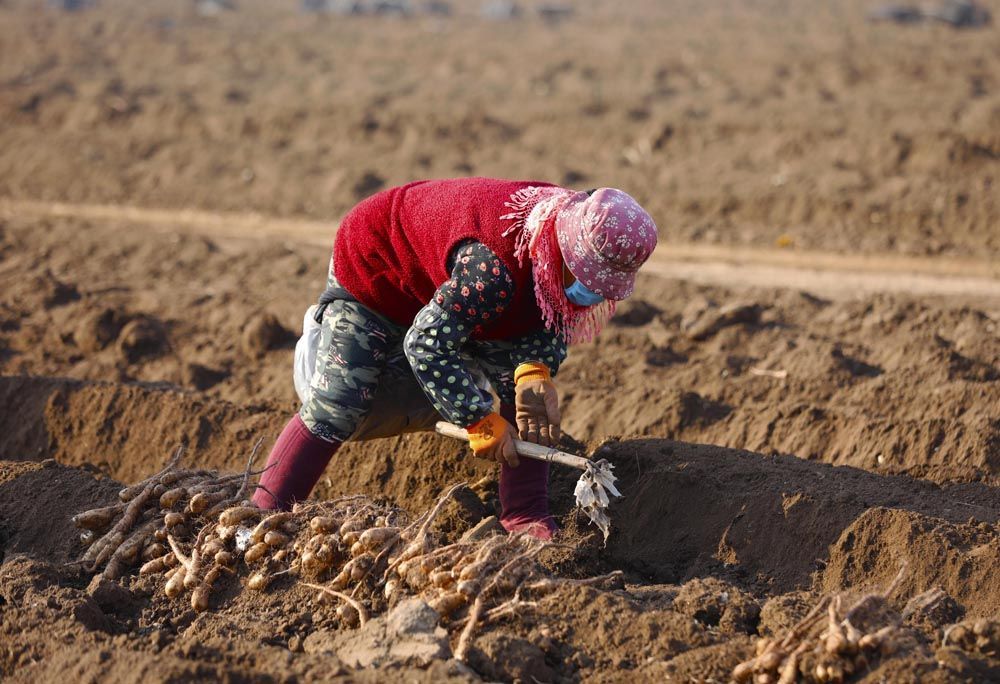 ↑11月14日,在永清县后奕镇团聚庄村一处山药苗育苗基地,农户在采挖山药苗。(庞趁友 摄)