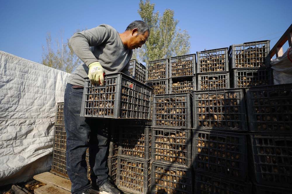 ↑11月14日,在永清县后奕镇团聚庄村一处山药苗育苗基地,农户将山药苗装车。(庞趁友 摄)