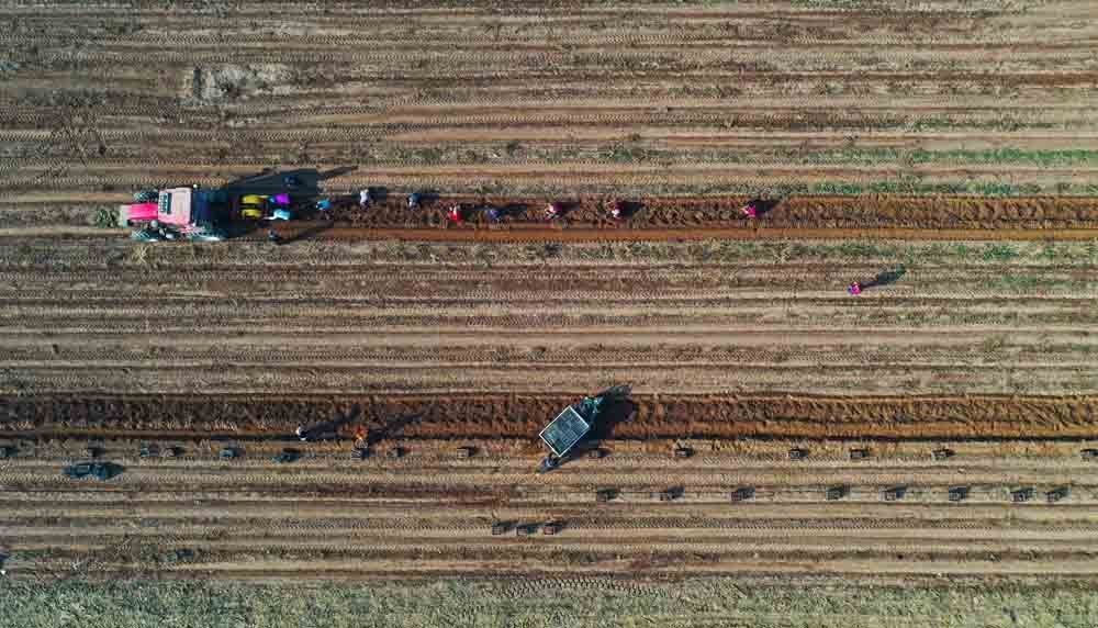 ↑11月14日,在永清县后奕镇团聚庄村一处山药苗育苗基地,农户在采收山药苗(无人机照片)。(庞趁友 摄)