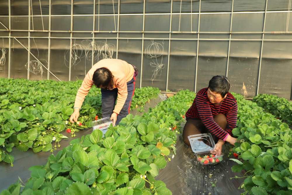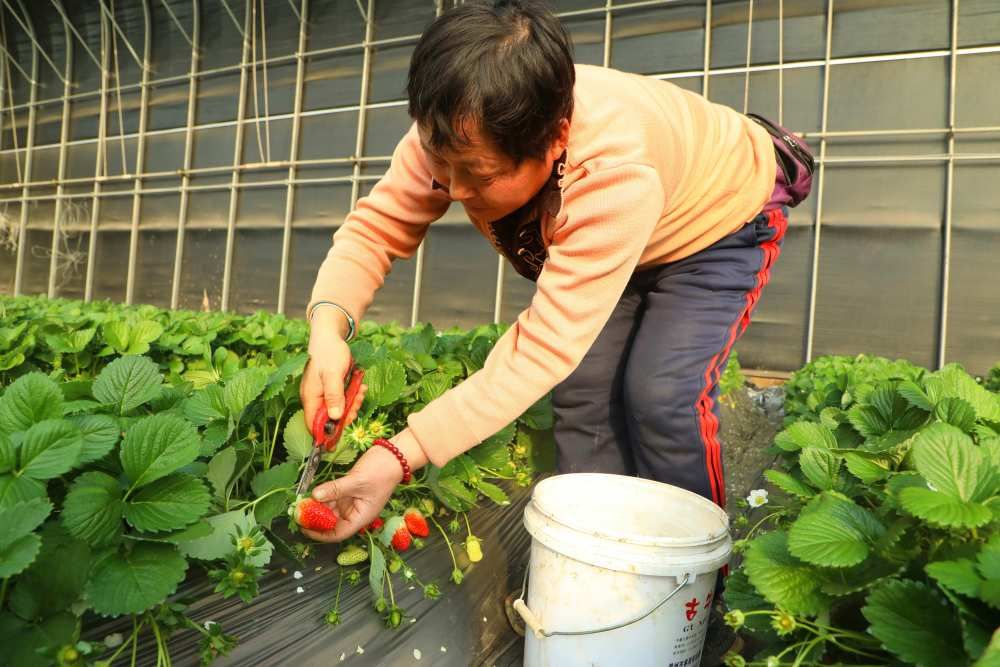 ↑12月5日,种植户在香河县蒋辛屯镇一处果蔬种植大棚采摘草莓。