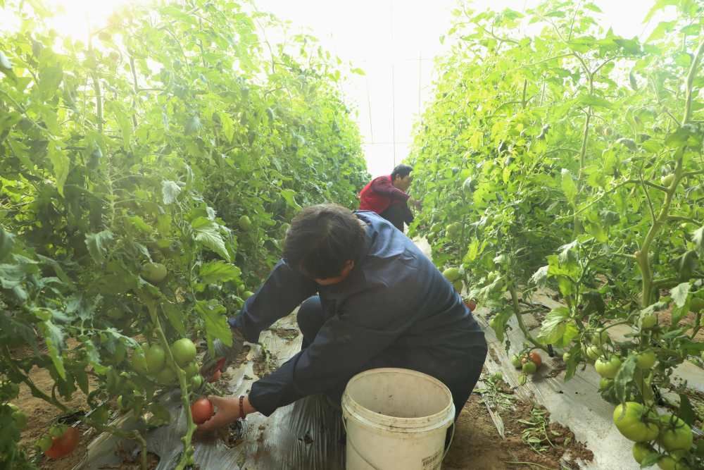↑12月5日,种植户在香河县蒋辛屯镇一处果蔬种植大棚采摘西红柿。