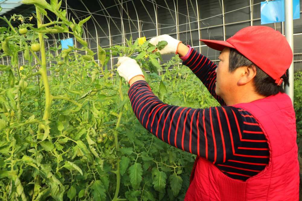↑12月5日,种植户在香河县蒋辛屯镇一处果蔬种植大棚修剪西红柿枝叶。
