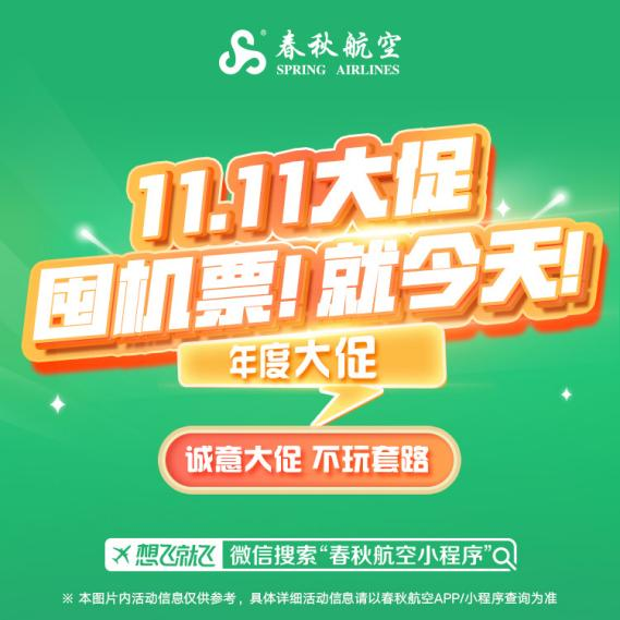 即日起,至11月11日,春秋航空在其官方自有渠道(春秋航空APP、小程序、官网)推出“11.11”机票年度大促——有双十一折扣机票、每日整点红包雨、大额优惠券、每日签到赢积分等机票特惠活动。