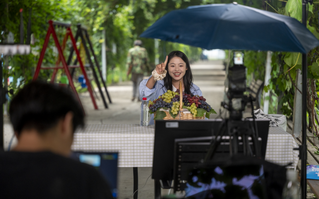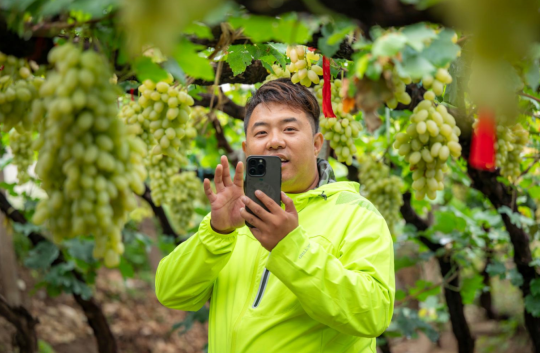“尝尝咱这葡萄,甜到心里!”“有这水肥一体化、太阳能杀虫灯等技术,产量都提高了!”“大家好,欢迎直播间的家人们,这是早晨新摘下来的果子……”