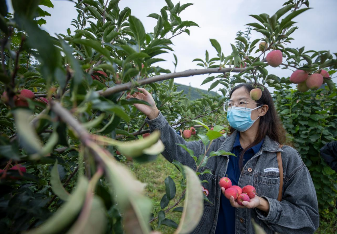 “农场建于2010年,占地面积有800余亩,种植了苹果、梨等果树6000余棵,还有野生中草药40余种。苹果种类也很多,像北海道、嘎啦、金红等,因为地理条件,距离延庆也近,所以来采摘的延庆游客也很多。”农场负责人孙利说。