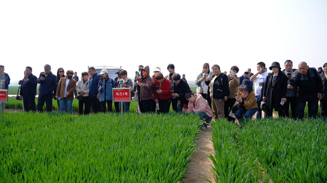 在马兰农场,大家实地观摩新品种马兰1号超高产示范田,学习先进的种植管理技术。河北大地种业有限公司副总经理宋春景详细介绍马兰1号品种的强大优势,苗期叶色浓绿,分蘖多且粗壮,植株呈“V”字型生长,抗病性强,矮秆强抗倒,连续两年实打实收测产破河北省小麦高产纪录,目前已测出的最高亩产达到863.7公斤,未来有望实现更高的突破。