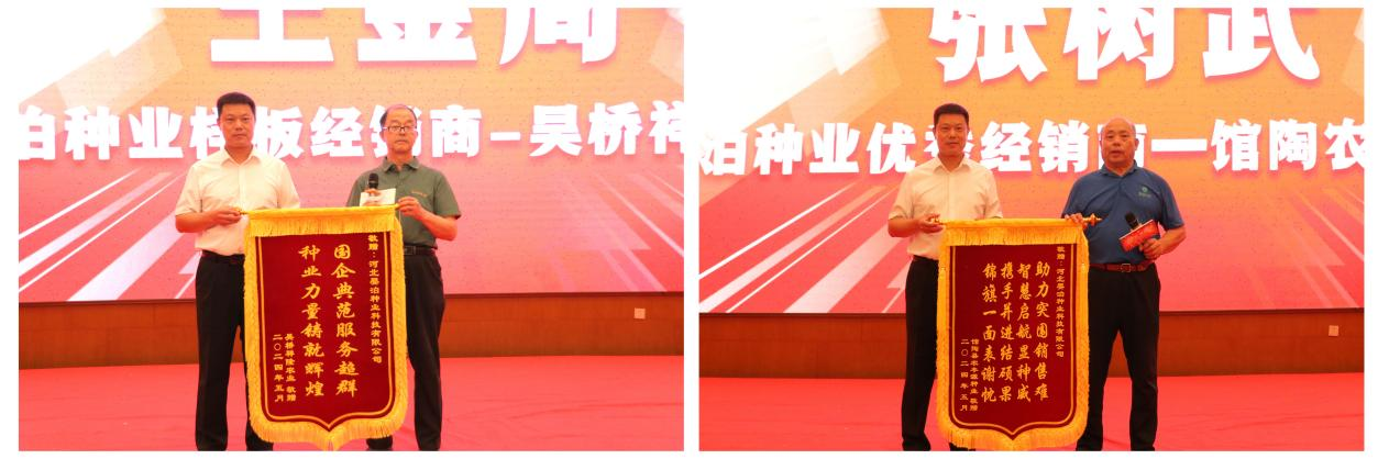 自2024年1月20日《婴泊商学院》正式启动后,婴泊种业服务铁军与各位大商通力合作,共同学习共同成长。其中,婴泊种业将吴桥作为样板市场重点打造,吴桥祥隆农业从中获益匪浅;在扶商行动中,馆陶县农丰源种业显著获益,尤其得益于婴泊种业的强力支持与赋能,其业绩表现突出。早在4月份,农丰源种业便已超越既定销售目标,提前实现了年度销售里程碑,彰显了扶商行动的积极成效与双方合作的卓越成果。分别现场赠送给婴泊种业锦旗表示衷心的感谢。