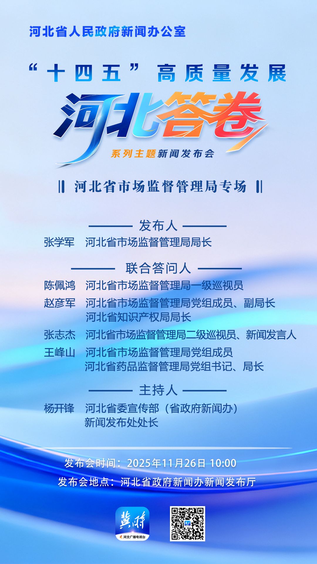 11月26日(星期三)上午10时,河北省政府新闻办将举办“十四五”高质量发展河北答卷系列主题新闻发布会,邀请河北省市场监督管理局主要负责同志介绍“十四五”时期河北省市场监管工作高质量发展成果,并与该局相关负责同志共同回答记者提问。冀时客户端同步直播,敬请关注。