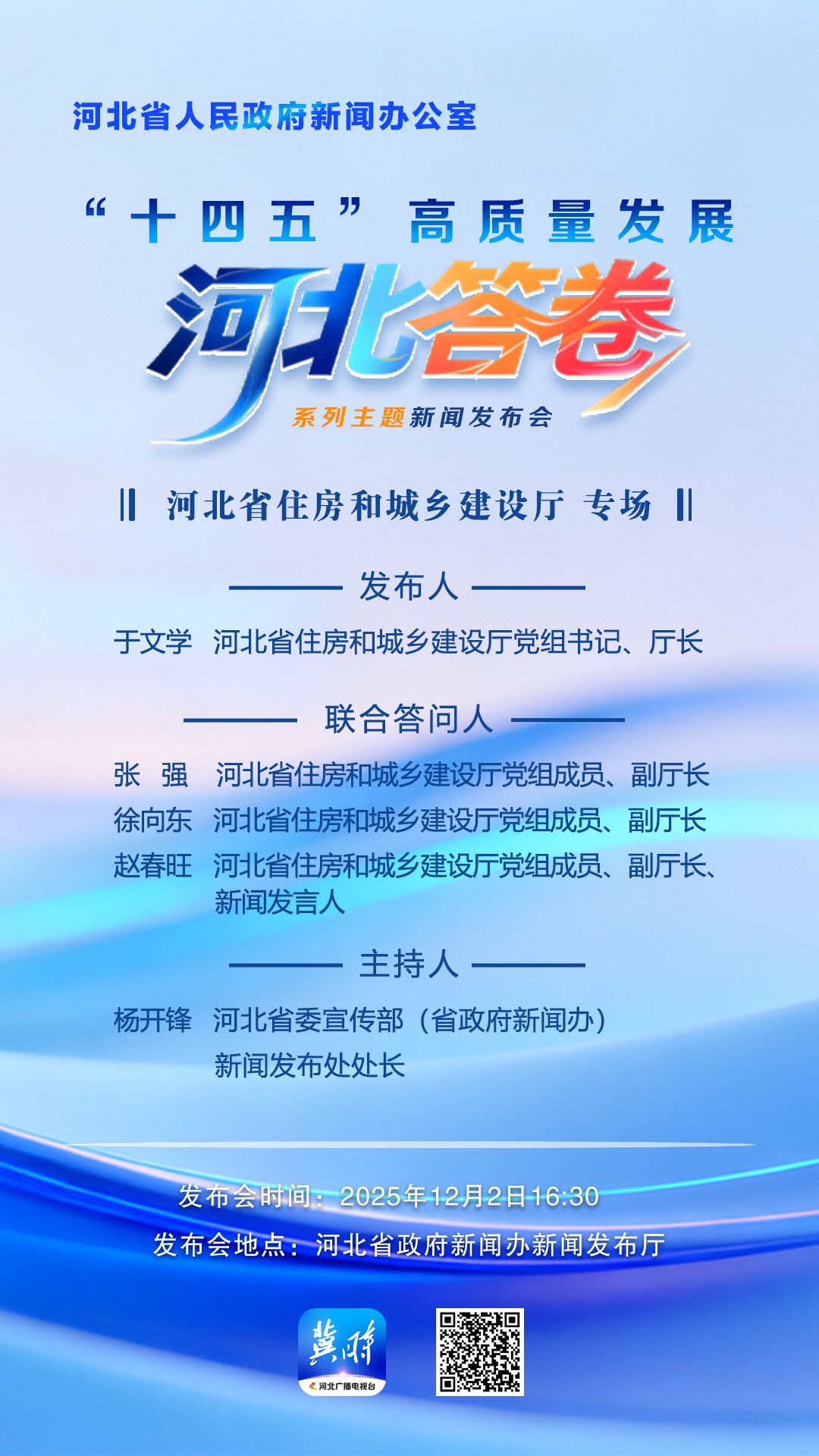 12月2日(星期二)16:30,河北省政府新闻办将举办“十四五”高质量发展河北答卷系列主题新闻发布会,邀请省住房和城乡建设厅主要负责同志介绍“十四五”时期河北省住房城乡建设高质量发展情况,并与该单位分管负责同志共同回答记者提问。冀时客户端将直播本场发布会,敬请关注。