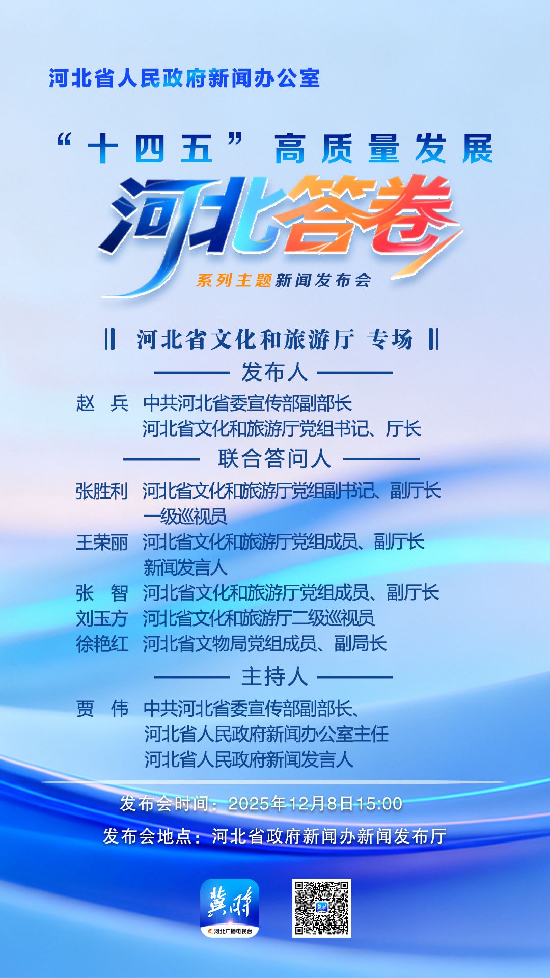今天(12月8日)15时,河北省政府新闻办将举办“十四五”高质量发展河北答卷系列主题新闻发布会,邀请省文化和旅游厅主要负责同志介绍“十四五”时期河北省文化旅游事业发展情况,并与该厅相关负责同志共同回答记者提问。冀时客户端将直播本场发布会,敬请关注。