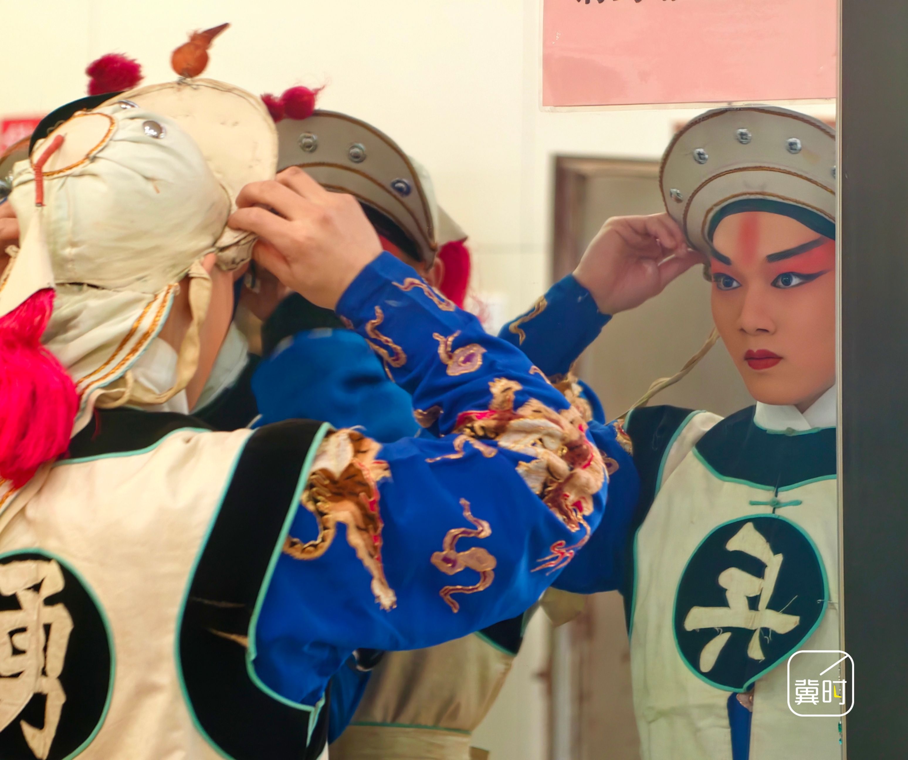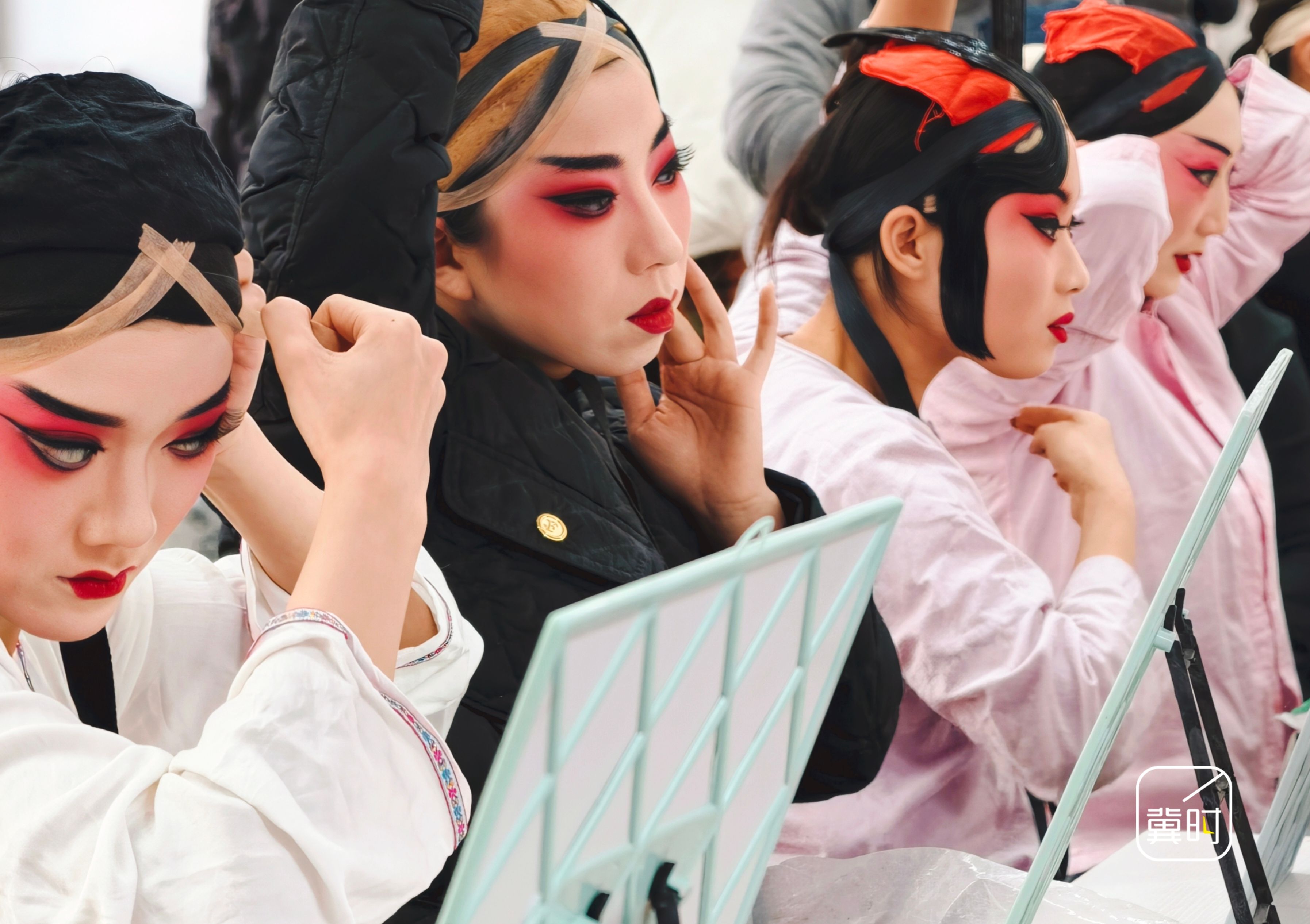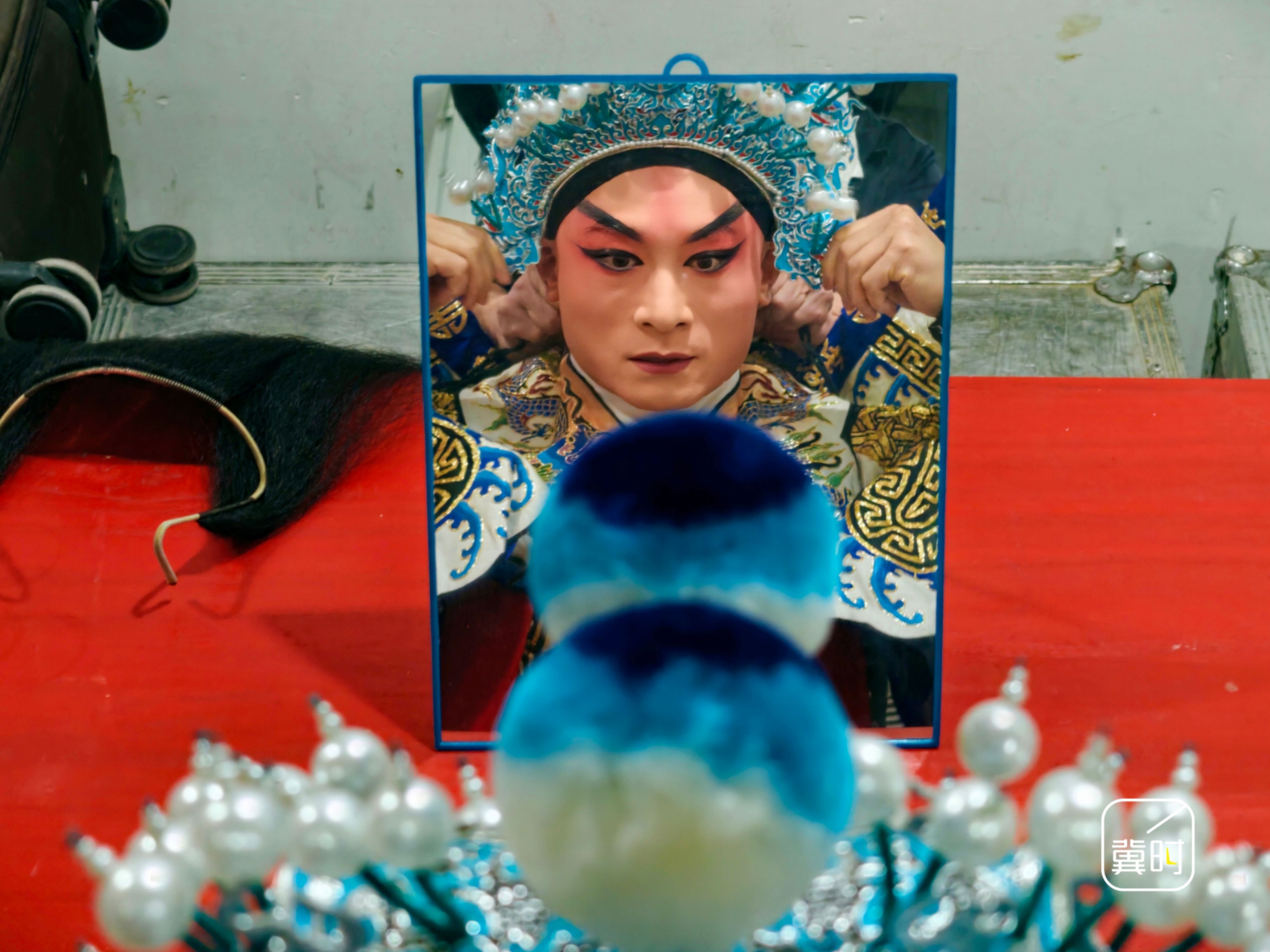 在后台小小天地里,戏曲演员们正对着镜子精心上妆、佩戴头饰,在方寸之间完成华丽蜕变。