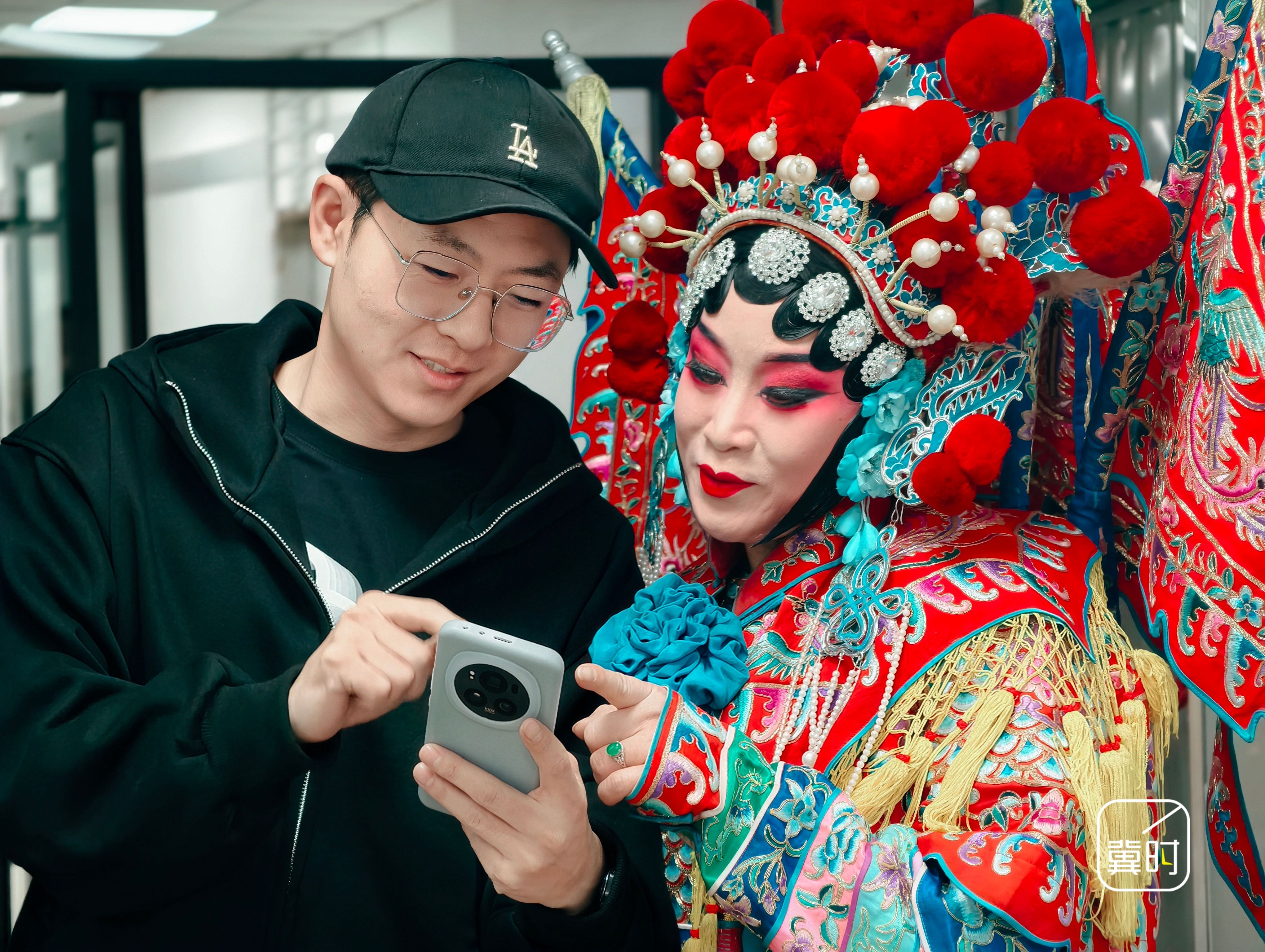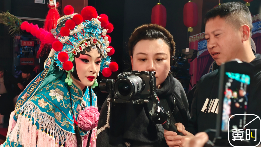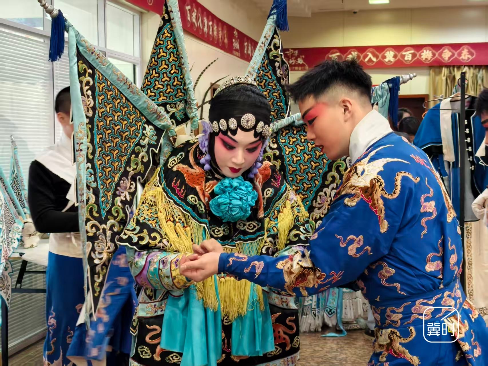 在后台小小天地里,戏曲演员们正对着镜子精心上妆、佩戴头饰,在方寸之间完成华丽蜕变。