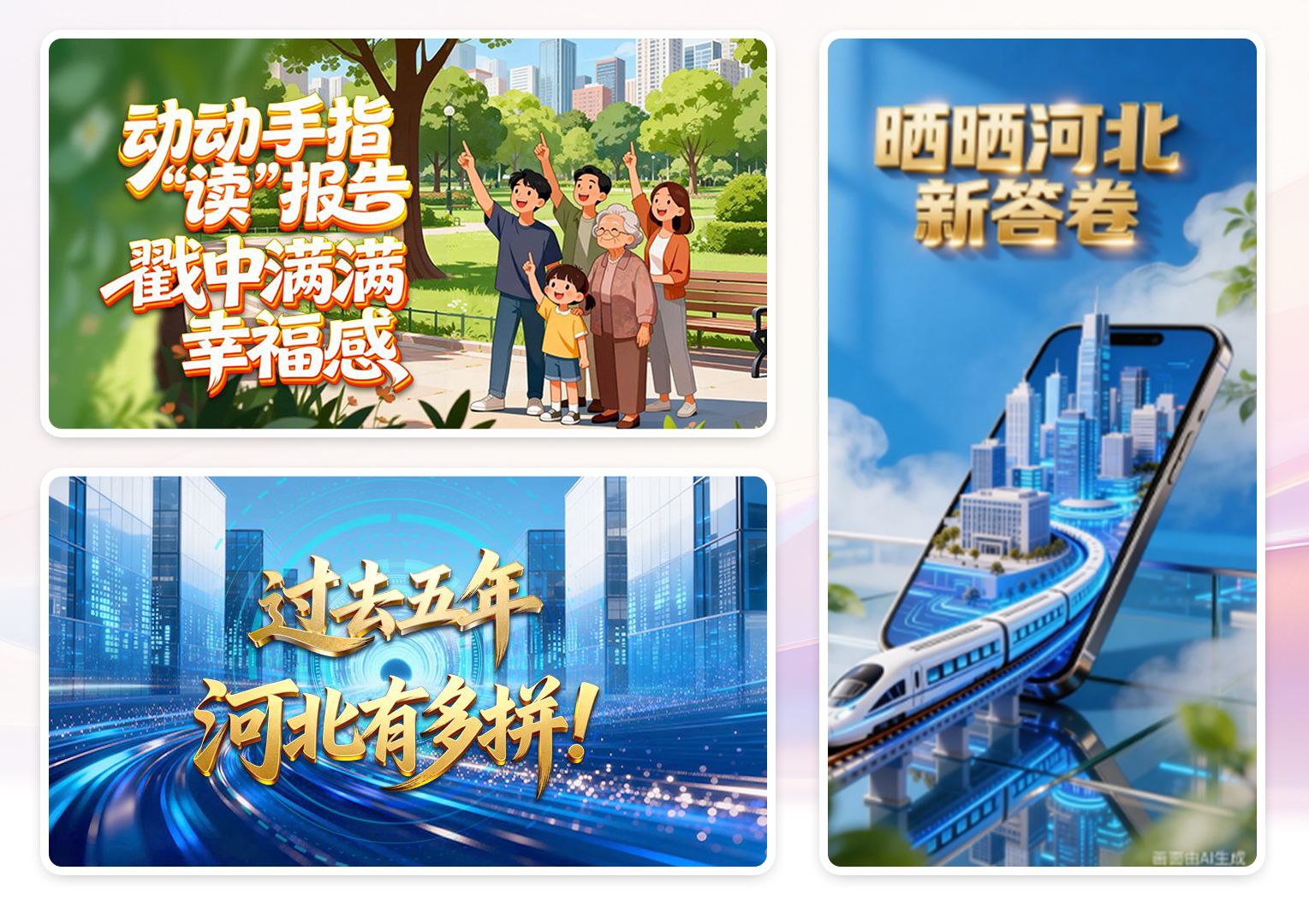 短视频《【AI动画】晒晒河北新答卷》,以一镜到底的“微缩景观+动画特效”,浓缩河北“十四五”亮点成就,让受众在趣味中感知发展密码。《动动手指“读”报告 戳中满满幸福感》《十图看懂:过去五年,河北有多拼!》等SVG 互动海报,让网友通过点击互动解锁两会内容,持续增强参与感与体验感,实现两会内容的轻松触达。