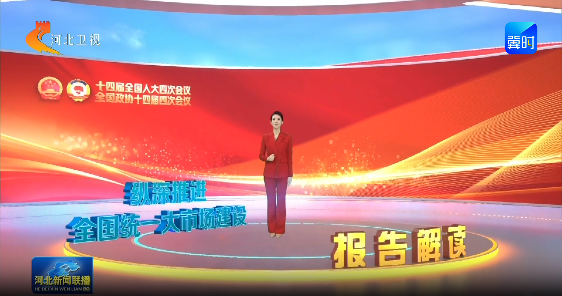 依托MR、AIGC等媒体技术,采用“技术支撑+场景落地+互动传播”的报道模式,打造具有科技范和未来感的两会报道新体验。北京融媒体演播室搭载 MR 虚拟现实技术,主播可一键“穿越”虚拟场景,借助可视化图表让政府工作报告中的抽象数据“活”起来,将发展成果转化为直观的视觉场景。全虚拟专栏《报告解读》全程采用虚拟演播室 + 实时场景渲染制作,将两会热议、政策框架、发展路径动态呈现。同时,实时调用雄安新区、雪如意、燕赵钢铁实验室等河北特色实景与地标素材,让政策解读与河北发展实践同频共振、深度沉浸。
