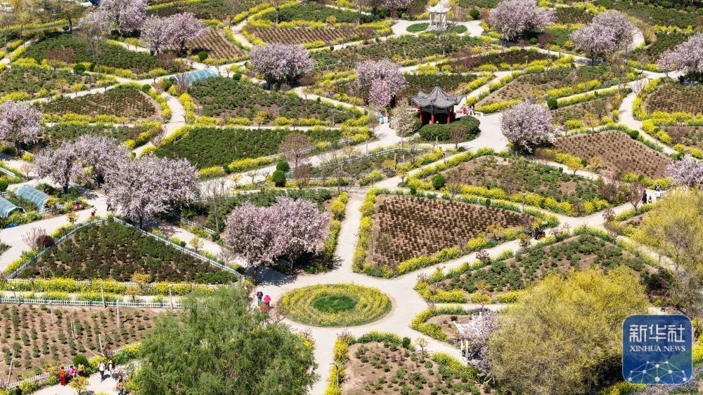 ↑ 4月6日,游客在河北省晋州市周家庄乡农旅观光园赏花游玩(无人机照片)。新华社发(梁子栋摄)