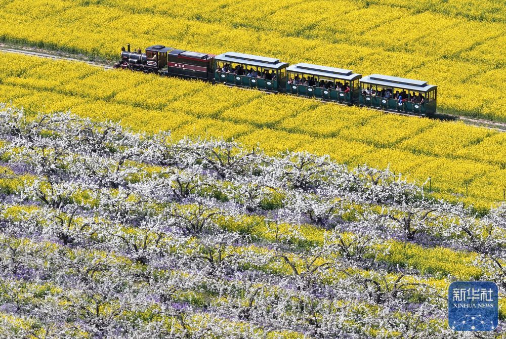 ↑ 4月6日,游客乘观光小火车从河北省晋州市周家庄乡第九生产队梨园旁经过(无人机照片)。新华社记者 杨世尧 摄