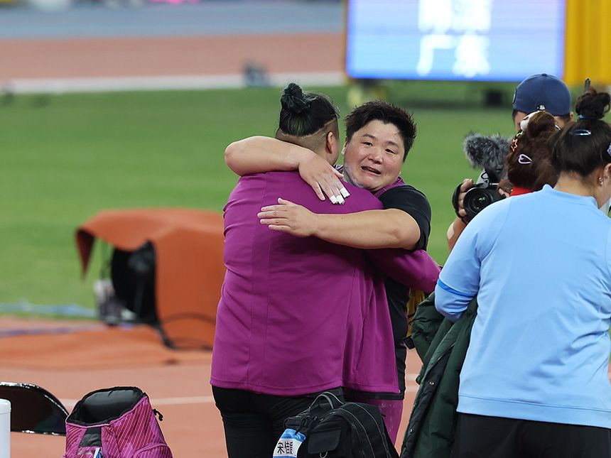 河北运动员巩立姣赛后拥抱对手。耿辉摄