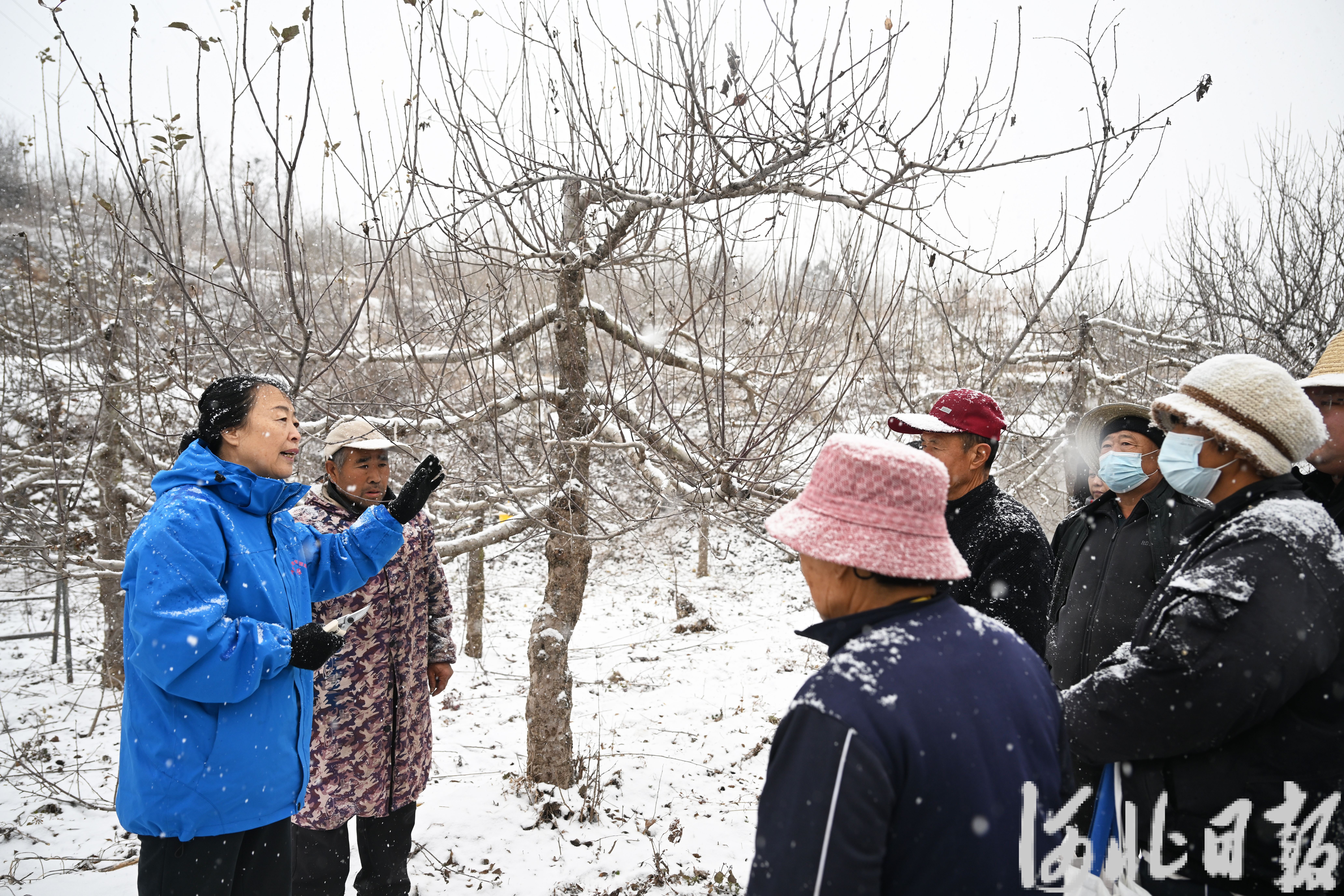 12月12日,李保国科技兴农专家团队队长、河北农业大学研究员郭素萍在临城县贾庄村为果农讲授苹果树冬季管理技术。河北日报记者赵永辉摄