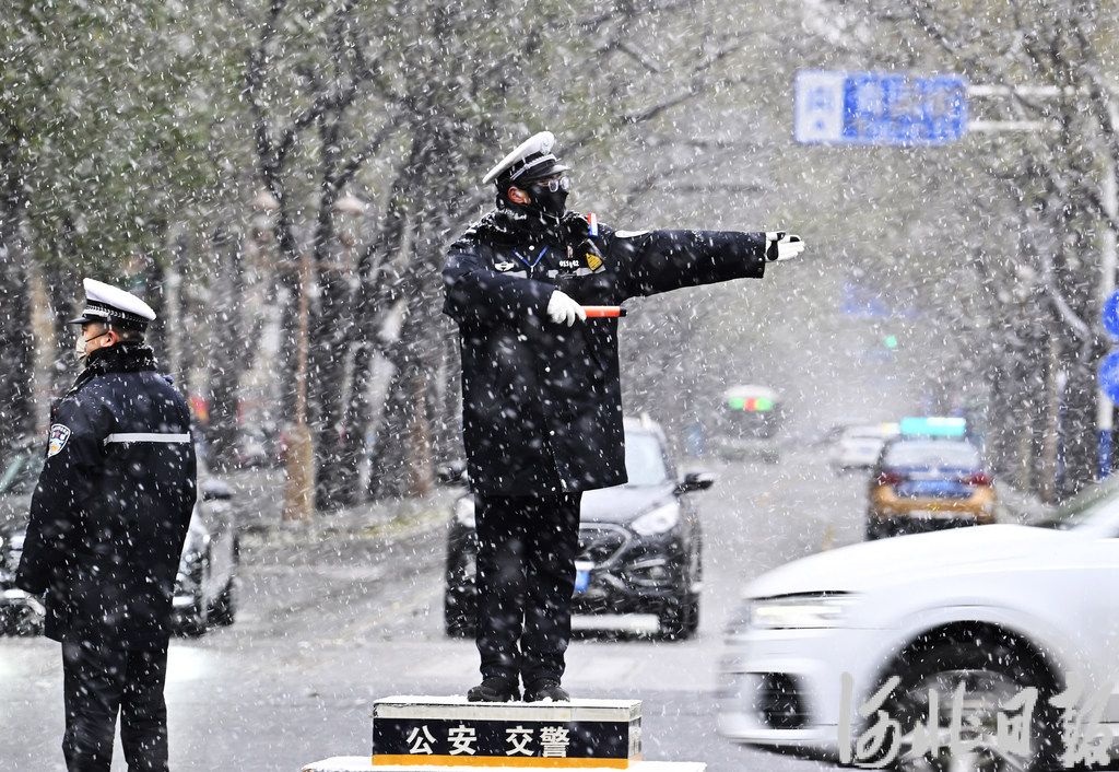 12月12日,在石家庄市裕华东路和青园街交叉口,交警冒雪疏导交通。河北日报记者贾恒摄