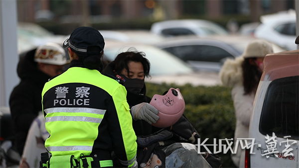 女子中队女警在路口劝导群众佩戴头盔。长城网·冀云客户端记者 李全 摄