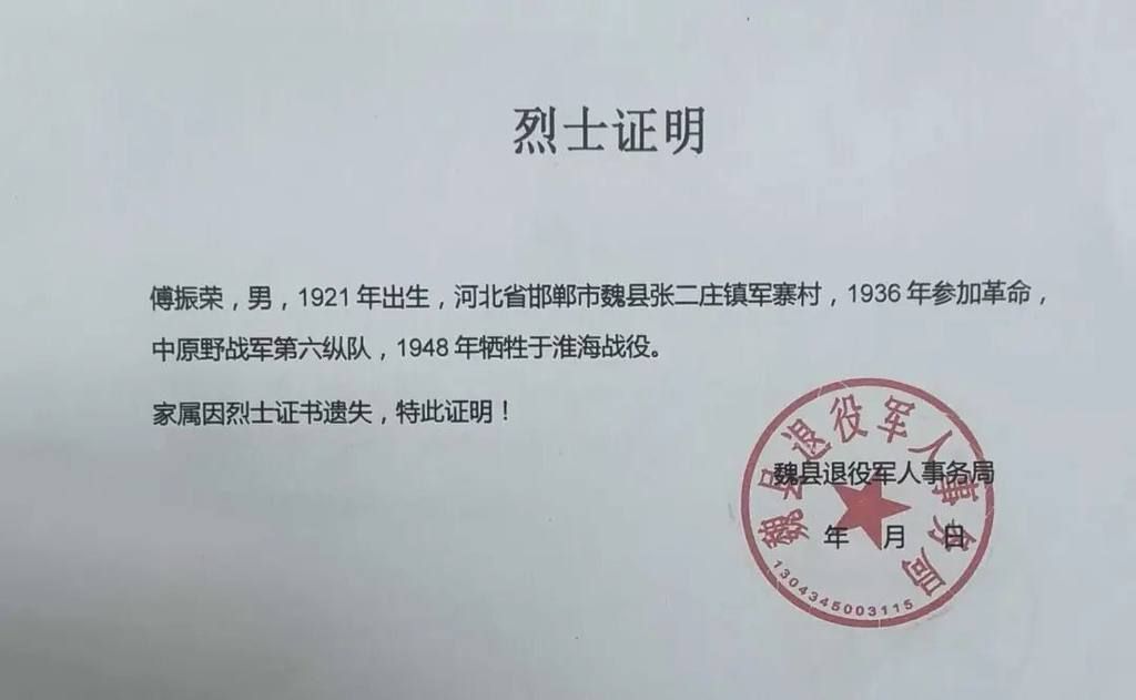 傅振荣烈士证明
