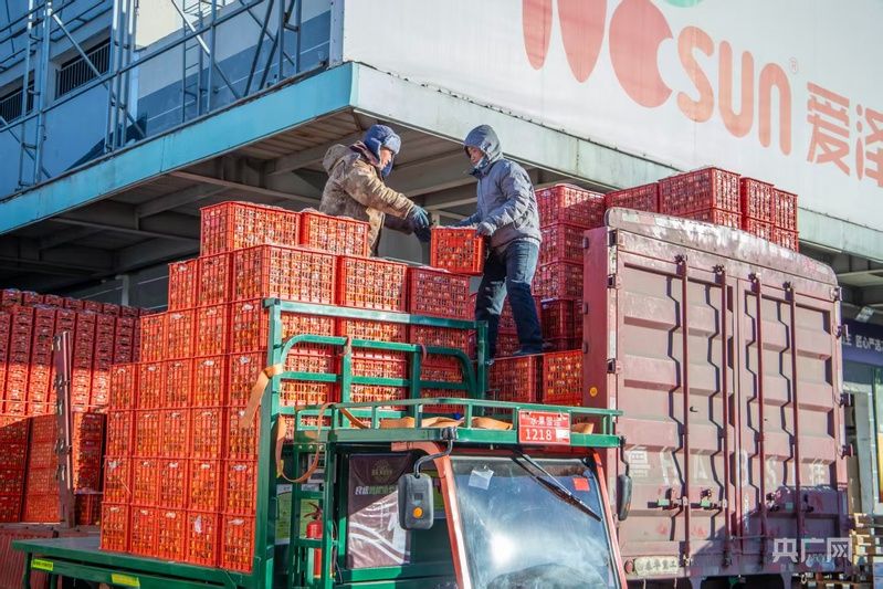 水果区的热闹丝毫不减,小宝哥档口的摊位前,工人正将一箱箱山竹、车厘子装车。档口工作人员郝二毛指着身后的几辆货车,“我们会随时关注实时交易量、价格波动什么的,基本也是根据数据调货,既不囤货抬价,也不会断供,春节期间完全能保证供应。”