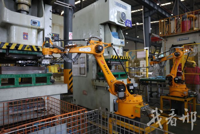 在河北华曙新能源汽车科技有限公司冲压车间,关节臂机器人正在高效运转。李世强摄