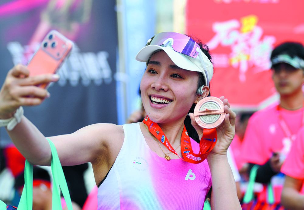 图为一名参赛选手赛后手持完赛奖牌自拍留念。 新华社发 (张晓峰 摄)