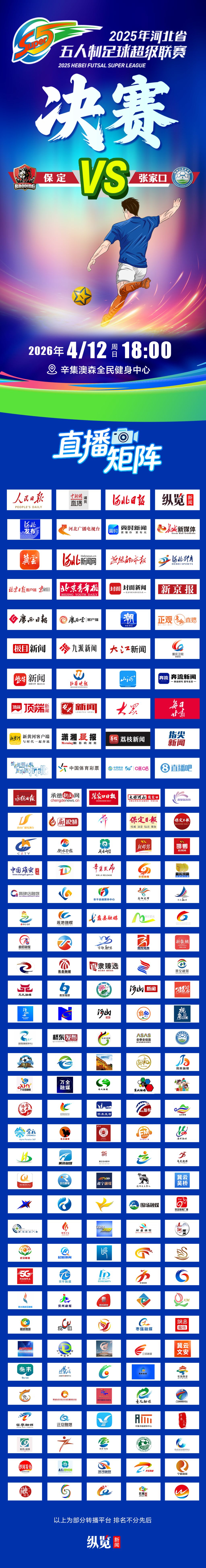 据赛事主办方介绍,本次赛事直播传播矩阵阵容强大,不仅联动中央媒体、省内外主流媒体及市县级融媒体中心,还联合省内各级体育、文旅、商务等平台账号以及咪咕、直播吧等专业直播平台,实现多平台、全覆盖传播。除河北省内主流媒体全程参与外,北京日报、北京青年报、九派新闻、紫牛新闻、荔枝新闻、极目新闻、封面新闻等40余家省外省级主流媒体也将同步直播决赛盛况。相关负责人表示,全覆盖式直播矩阵是“河北五超”办赛模式的一大创新,全方位打通线上观赛渠道,让全国各地球迷都能实时见证精彩对决。